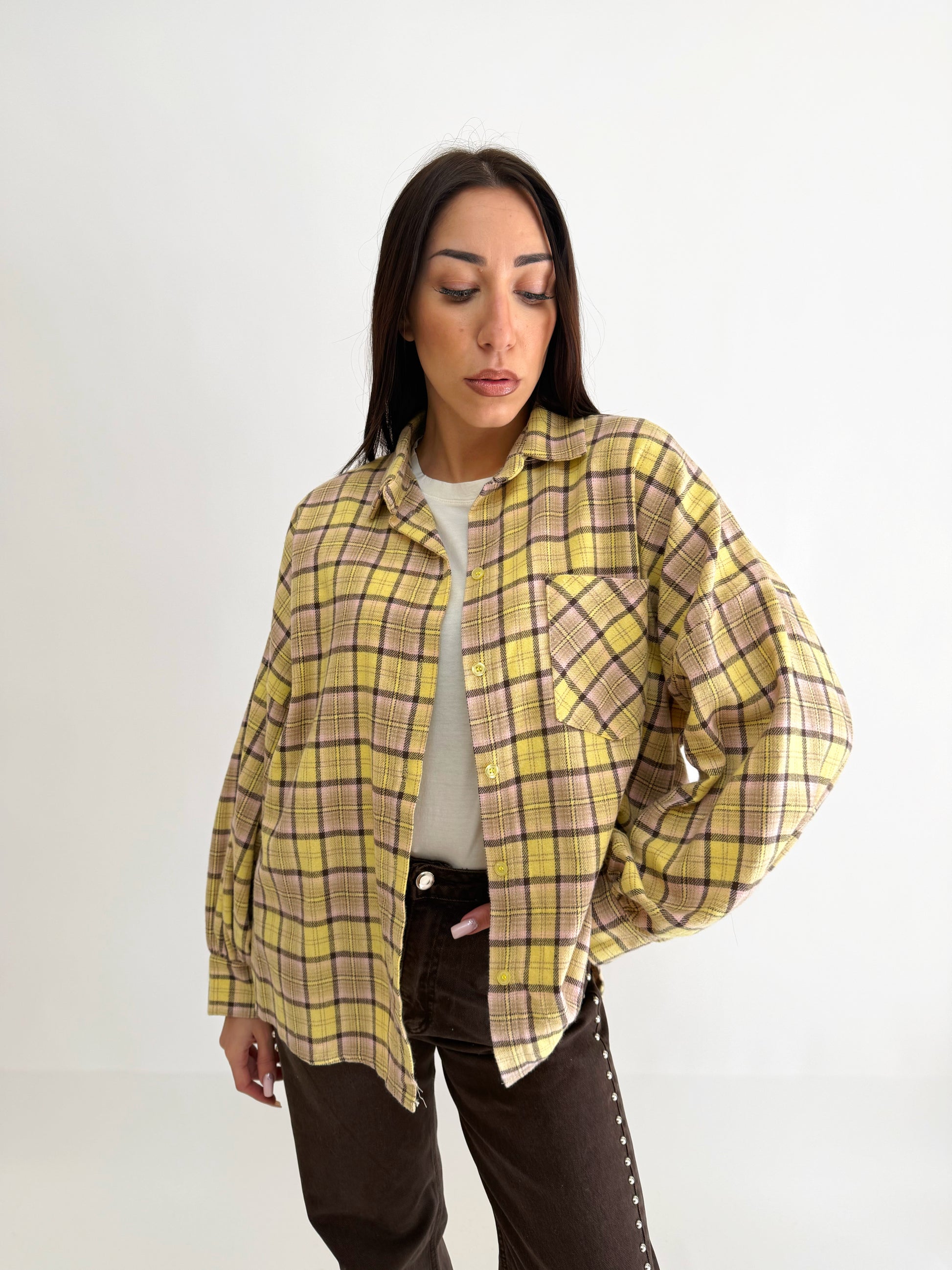 Camicia in flanella fantasia check, allacciatura frontale con bottoni , polsino leggermente a sbuffo, taschino altezza seno.