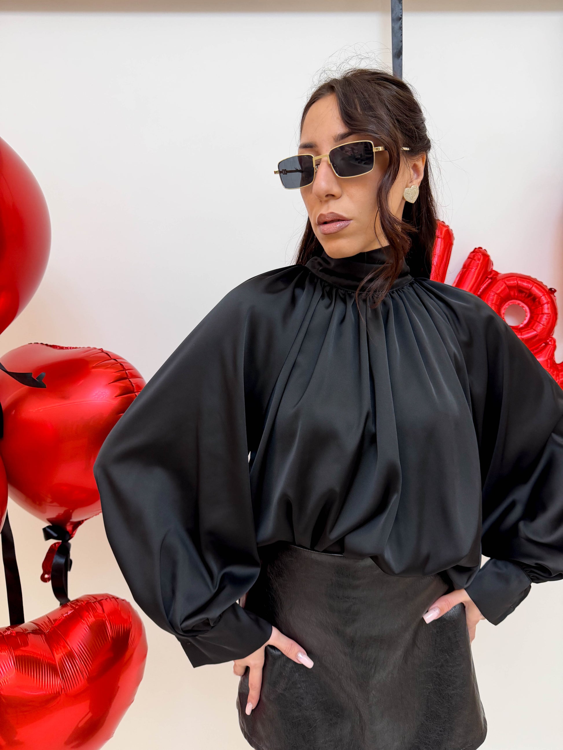 Camicia in raso con drappeggio sul fronte e chiusura a fiocco sul retro, manica a palloncino.